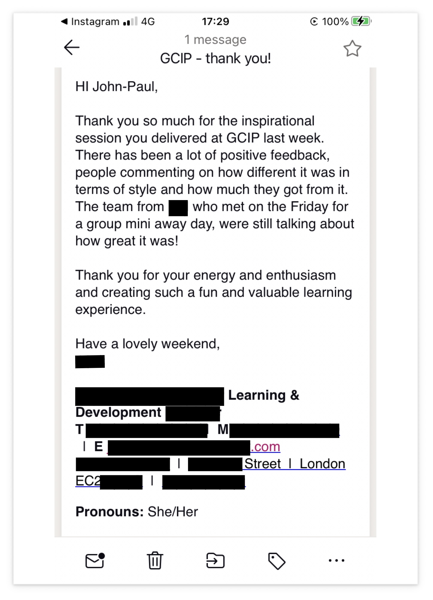 The feedback: “inspirational”, “people still talking about how great it was” and “how different it was in terms of style and how much they got from it”.